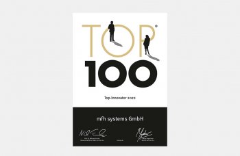 Der Wirtschaftsjournalist Ranga Yogeshwar ehrte persönlich mfh systems mit dem TOP 100-Siegel 2022 und überreichte Geschäftsführer Daniel Schuschan die Auszeichnung. Nach 2021 ist es bereits das zweite Mal, dass mfh systems diesen Innovationspreis erhalten hat. Das TOP 100-Siegel wird nur besonders innovativen mittelständischen Unternehmen vergeben, die zuvor ein wissenschaftliches Auswahlverfahren mit über 100 Innovationsindikatoren durchlaufen haben.